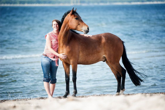 Beim Fotoshooting sah er zum ersten Mal das Meer und vertraute mir soweit, das er nach 2 Minuten vorsichtig gucken, gleich ins Wasser gegangen ist. Eine etwas größere Welle hat ihn aber erschreckt und er ist mit einem Satz wieder aus dem Wasser gehopst. Am Strand konnte ich ihn dann auch vom Halfter abmachen und er blieb bei mir.